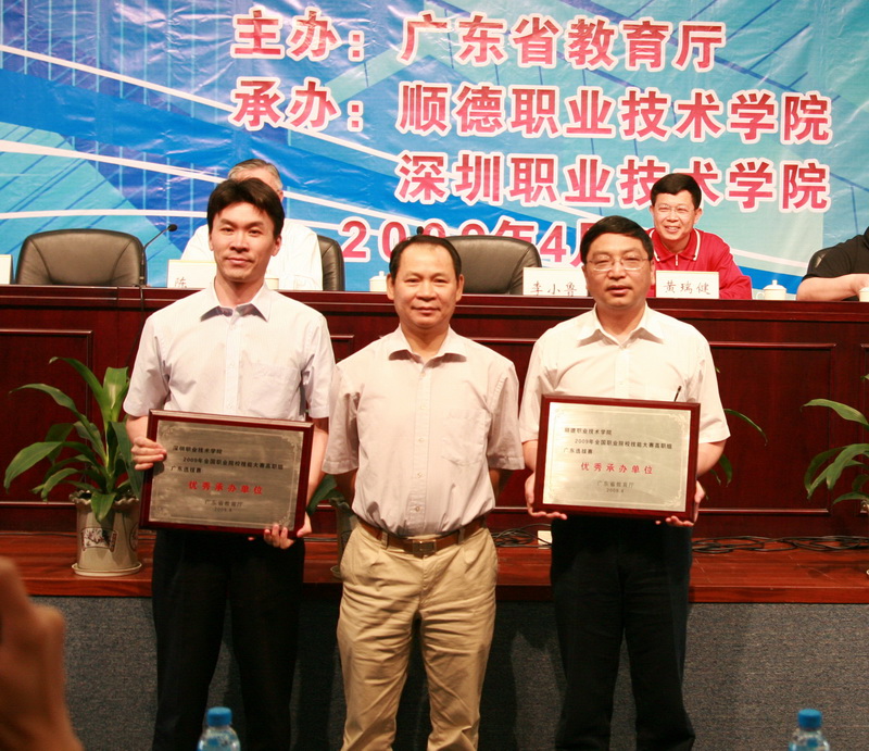 4月27日, 2009年全国职业院校技能大赛广东省选拔赛圆满结束。本届大赛共设四个比赛项目,我院荣获了“电子产品设计及制作”、“产品造型设计及快速成型”、“数控机床装配、调试与维修”三个竞赛项目的一等奖,并将代表广东省参加6月份在天津举行的全国总决赛。“3G基站建设维护及数据网组建”项目我院也获得了二等奖和优胜奖各一项。本次大赛共选拔出28名选手参加全国总决赛,我院喜获全省最佳成绩,以一等奖数量、入选参加全国总决赛学生人数位列全省第一,共荣获团体一等奖4项、二等奖3项、优胜奖1项,单项一等奖4项、二等奖1项、优胜奖1项,麦竞荣、刘振标、李家新、徐健沛等13位同学入选参加全国总决赛。同时,由于我院的赛事承办工作表现优异、卓有成效,学院被广东省教育厅授予“2009年全国职业院校技能竞赛广东省选拔赛优秀承办单位”荣誉称号。