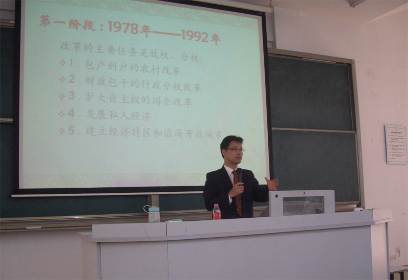 在讲座中,汤恺老师围绕主题,从改革开放三十年的阶段如何划分、如何看待改革开放三十年给中国带来的变化、如何看待当前中国改革发展面临的问题、如何总结改革开放三十年的经验四个方面,带领我们回顾了改革开放30周年来所创造的骄人成绩以及所遇到的不容忽视的问题,他的观点深入浅出,从回顾中引出反思,系统地将改革开放的内容展现在同学们面前。