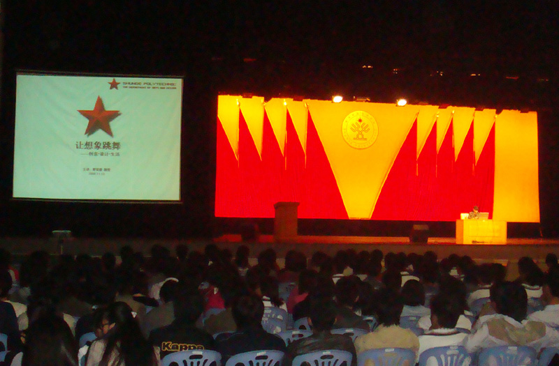 11月13日晚,学院社科普及周活动之一的“让想象跳舞——创意·设计·生活”专题讲座在梁球锯礼堂举行。艺术设计系副主任廖荣盛教授为七百多名师生进行了精彩演讲。