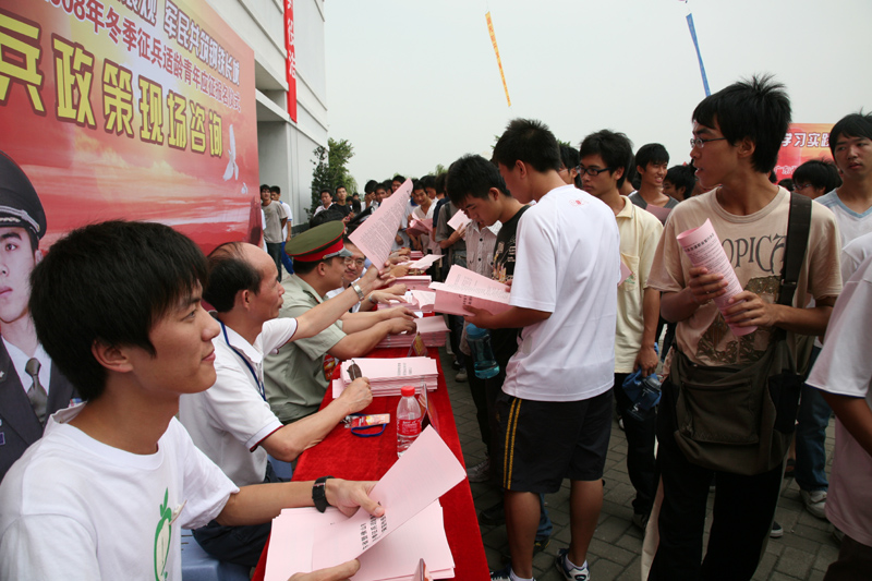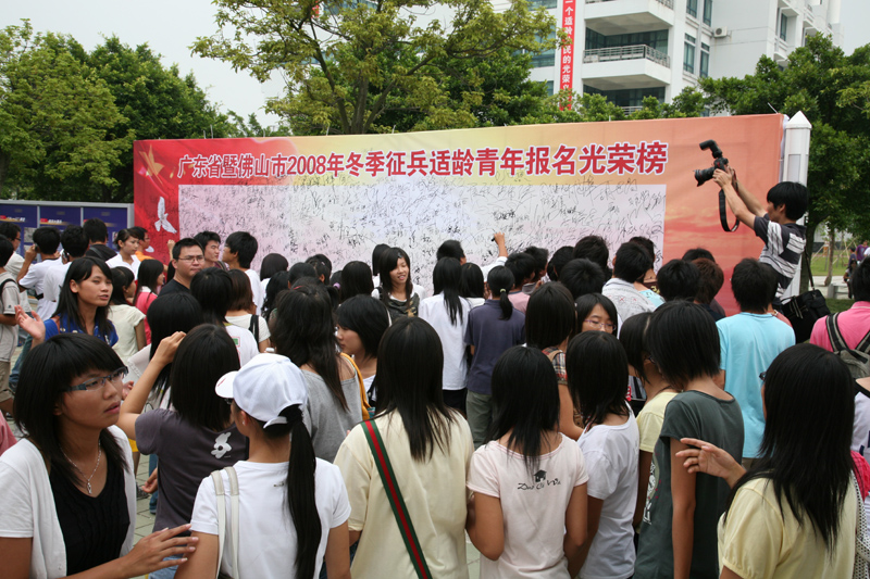 11月1日,广东省暨佛山市2008年冬季征兵适龄青年应征报名仪式在我院举行,广东省军区副政委赵存生少将、省军区参谋长孙汉波少将、佛山市、顺德区领导刘海、冼瑞伦、刘谦强、邓华、邓永强、我院党委副书记、院长陈智、省教育厅、省公安厅、省民政厅等部门的相关负责人出席了仪式。参加启动仪式的还有来自30多个大中学校的5000多名莘莘学子,其中有我院学子4850名。