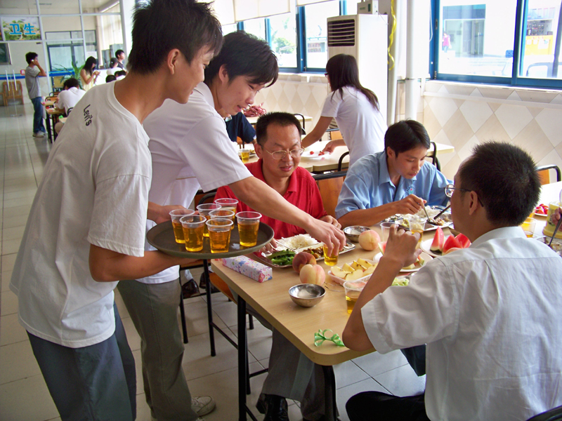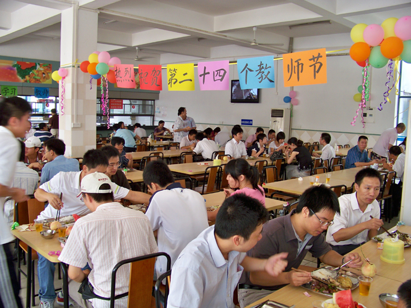 整个教工饭堂洋溢着浓厚的节日气氛。同学们为老师送上自己制作的 “节日快乐”卡片,当老师们打开卡片,一句句美好的问候和祝福赫然映入眼帘,笑语盈盈。在老师用餐时,学生干部们为老师送上了水果和饮料,再道一声:“老师,您辛苦了!”充分表达了同学们对老师的感激和祝福。为了使庆祝活动更具特色,学生干部们还在老师们用餐时举行抽奖活动,中奖的老师得到了精美的礼品。此时的饭堂温暖涌动,爱意无限。