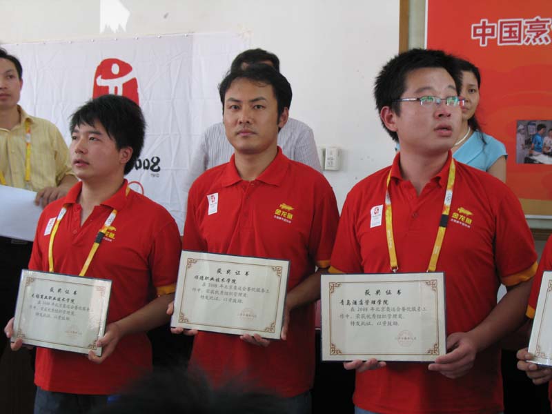 我院师生在奥运服务工作期间表现突出,荣获中国烹饪协会奥运餐饮服务项目临时团委颁发的“优秀组织管理奖”。我院屈腾飞同学作为学生代表在大会上发言,谈了自己的奥运感触和工作体会,赢得了赞许和掌声。我院李海烽和屈腾飞两名同学在“包饺子比赛”中荣获优秀奖。