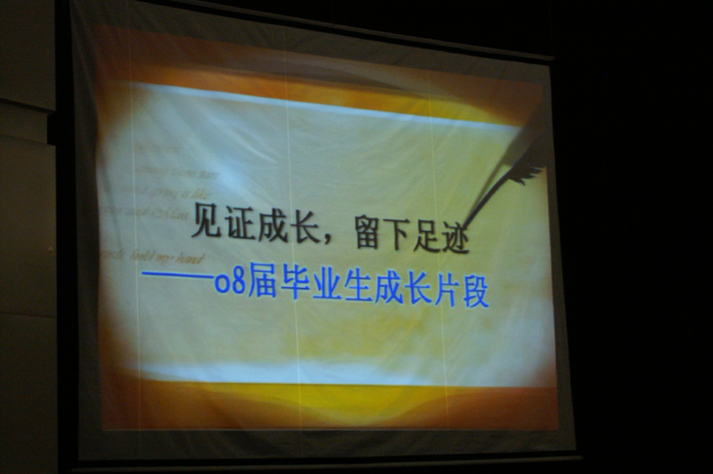 随后,电子屏上播放了“《见证成长,留下足迹》2008届毕业生成长短片”。“毕业生谈感受,谢师恩”的动人场面,一次次将现场气氛推向高潮,洋溢着青春的气息,张扬着毕业时的彭湃激情。三年的大学生涯仿佛在每个人晶莹的双眼中倒流,百般滋味涌现在心头,毕业生们都不禁握紧身旁同窗的手。