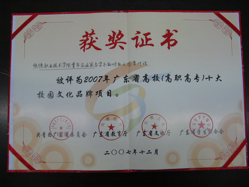 12月27日晚,由共青团广东省委员会、广东省教育厅、广东省文化厅、广东省学生联合会共同主办的“绽放青春,梦想校园”第二届广东大学生校园文化艺术节闭幕式暨颁奖晚会在华南理工大学体育馆举行。由我院团委选送的“青年企业家与学子面对面之非常对话”活动被评为2007年广东省高校(高职高专)十大校园文化品牌项目。