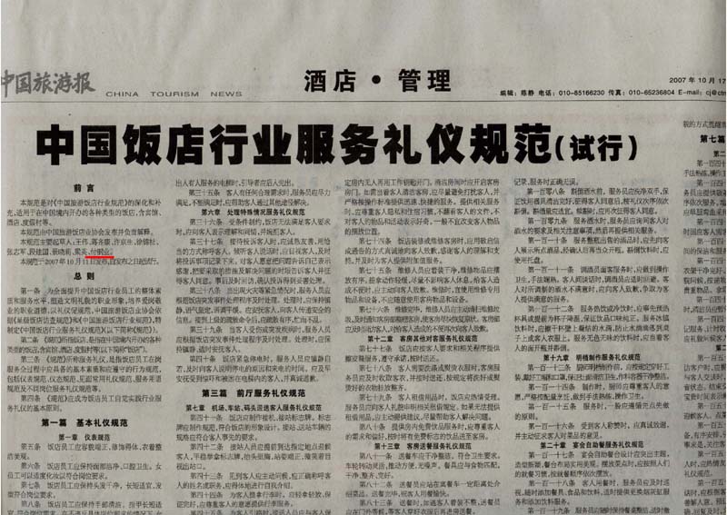 《中国饭店行业服务礼仪规范(试行)》是我国饭店业第一部服务礼仪规范,《中国旅游报》10月17日在第7版刊全文刊登,其单行本也于10月22日由旅游教育出版社面向全国发行。
