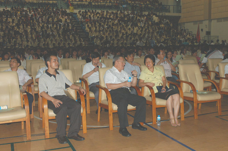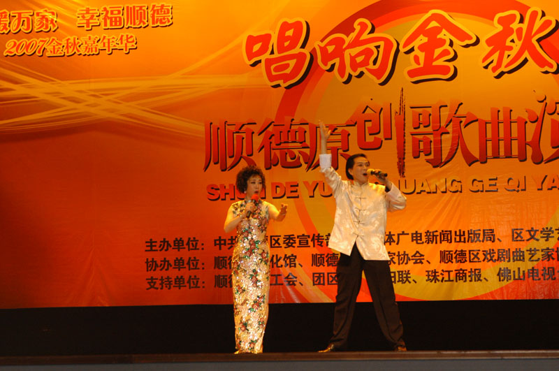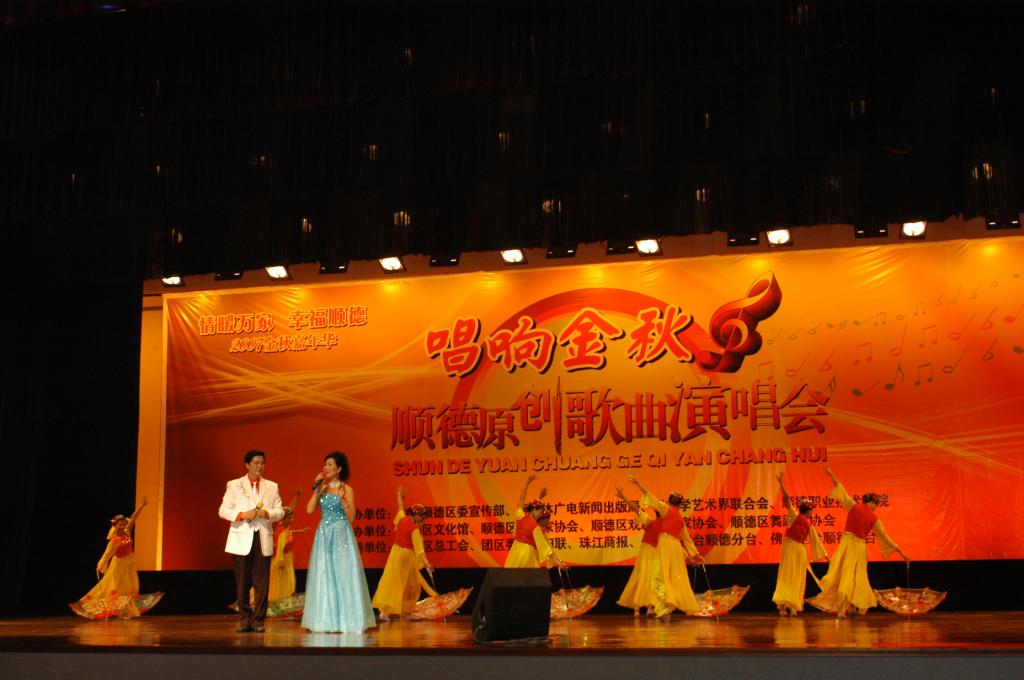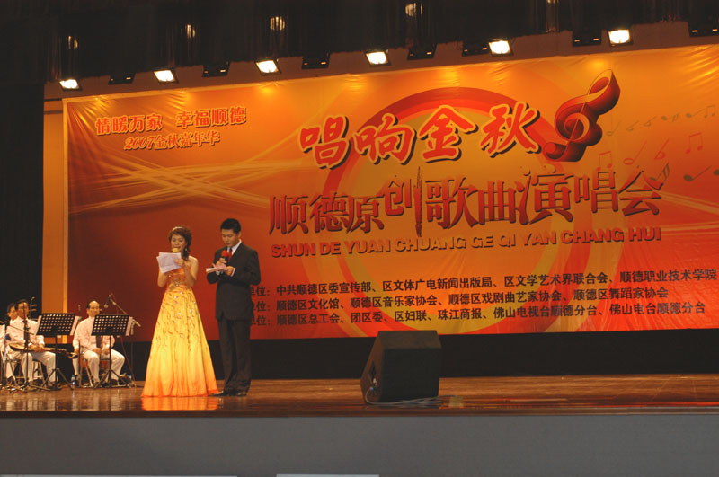 为了迎接党的十七大代表大会,为第二届顺德岭南美食节、龙舟大赛和艺术灯节的举办及为国庆节增添喜庆气氛,9月27日,由中共顺德区委宣传部、顺德区文体广电新闻出版局、太阳集团tyc4633、顺德区文学艺术界联合会联合主办的“唱响金秋——顺德原创歌曲演唱会”在我院隆重举行。区委常委、宣传部部长梁惠英,副部长沈涌等领导,学院领导陈智、何锐连、邹时智、陈粟宋、谭谦章、刘毓、徐刚,以及2007级的新生出席了演唱会。