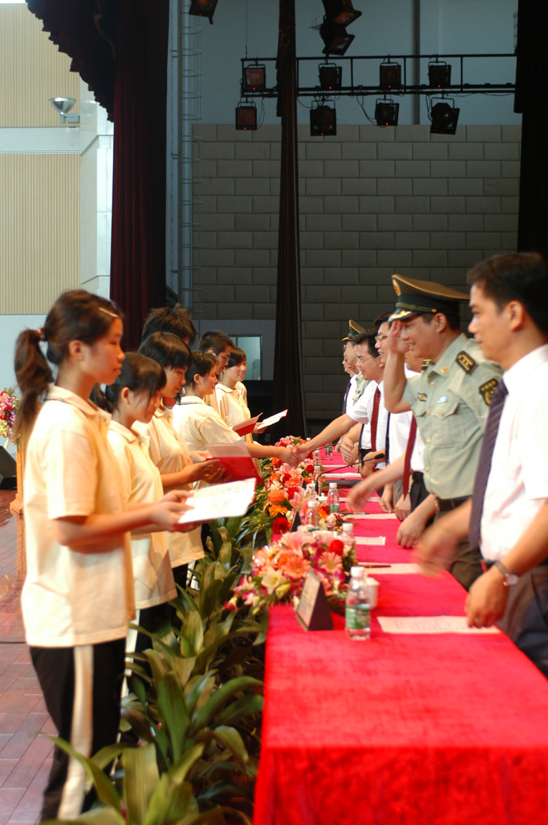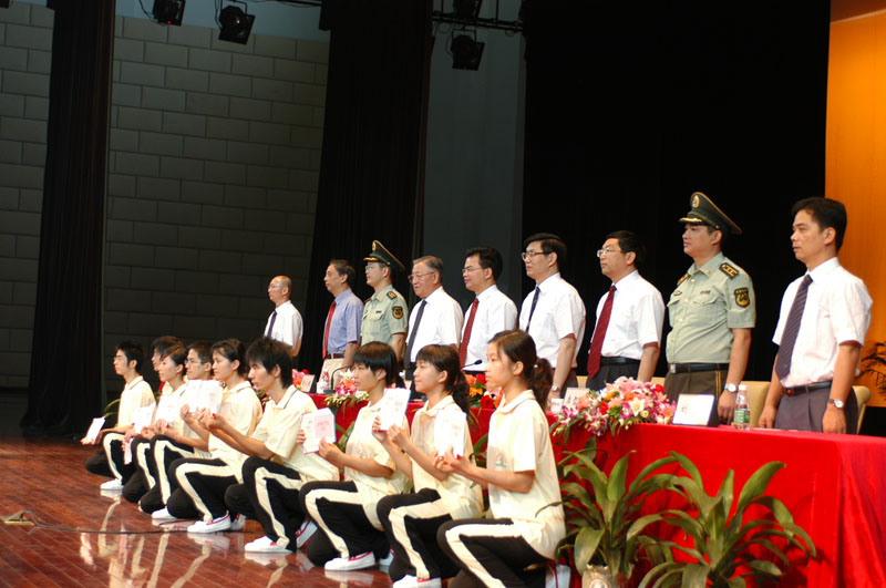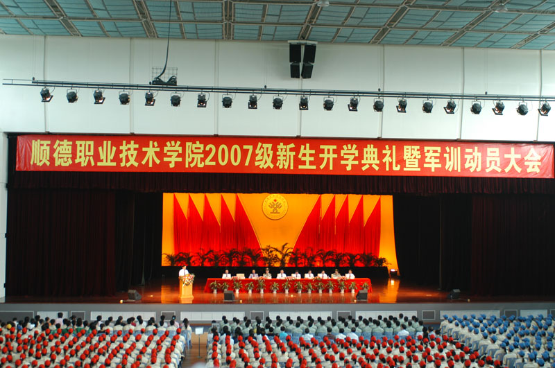 9月17日,学院2007级新生开学典礼暨军训动员大会在梁銶琚礼堂隆重举行。在一个多小时的大会中,新生一直保持着青春激昂、奋发向上的精神状态。顺德区副区长毛永天,顺德边防检查站站长胡小明、副站长李雪松,学院院长陈智,副院长邹时智、罗勇武、陈粟宋,纪委书记谭谦章,组织人事处处长刘毓,学院办公室主任徐刚,学院中层以上干部及2800多名新生参加了开学典礼。开学典礼由纪委书记谭谦章主持。