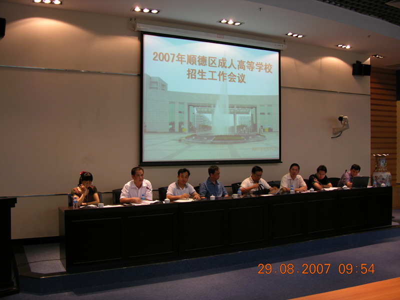 8月29日,顺德区教育局“2007年顺德区成人高等学校招生工作会议”在我院召开。区教育局副局长何超胜,招生考试科科长暨耀文、副科长温联洲及考试服务中心工作人员,各镇(街道)教育组及成人文化技术学校的领导,我院副院长罗勇武、继续教育部主任齐振彪、副主任王法勇以及相关人员共60多人参加了会议。会议由区教育局招生办暨耀文科长主持。
