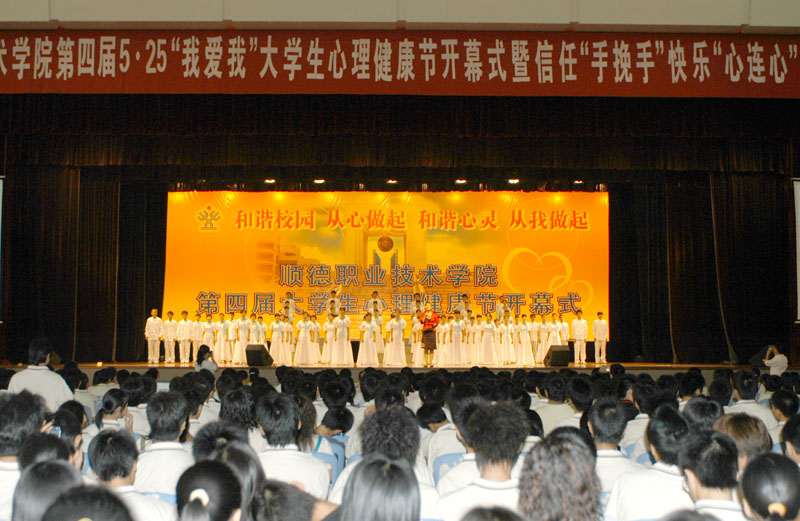 5月23日,我院第四届525大学生心理健康节开幕式暨“信任手挽手、快乐心连心”大型团体心理辅导在梁球锯礼堂举行。顺德区心理健康指导中心主任袁昌进,我院学生工作委员会主任、纪委书记谭谦章,学生处处长陈曦,各系主任、书记及1200多名学生参加了活动。