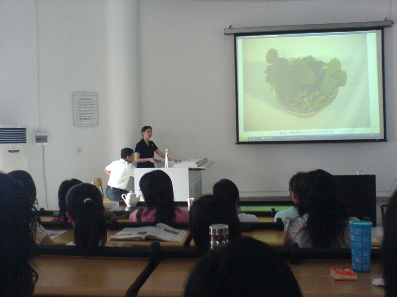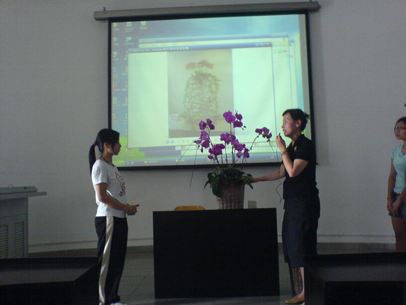 黄素南教授首先介绍了花卉生产的规范流程、2007年国际兰花展的概况,然后结合艺术设计系园林技术专业的学生特点,重点讲授了商业盆花组盆的艺术技巧及园林企业的展示设计。