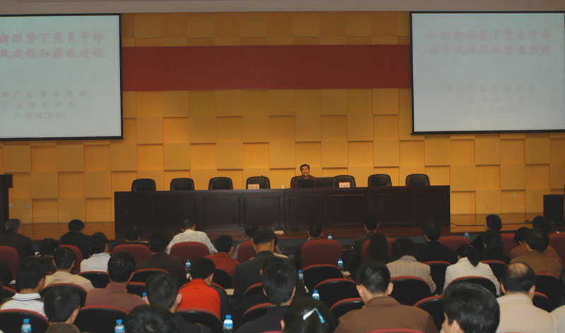 为认真学习胡锦涛总书记在中纪委第七次全体会议上的重要讲话精神,切实抓好党员干部作风建设,使党员干部保持振奋的精神和良好的作风,始终坚持党的根本宗旨,不断促进学院各项工作再上新台阶,4月11日,学院邀请中共广东省委党校、广东行政学院卢嘉旗教授来学院做了《加强新形势下党员干部的作风建设和廉政建设》专题讲座。陈智、邹时智、罗勇武、谭谦章、刘毓、徐刚等院领导及全体教师聆听了报告,讲座由副院长何锐连主持。
