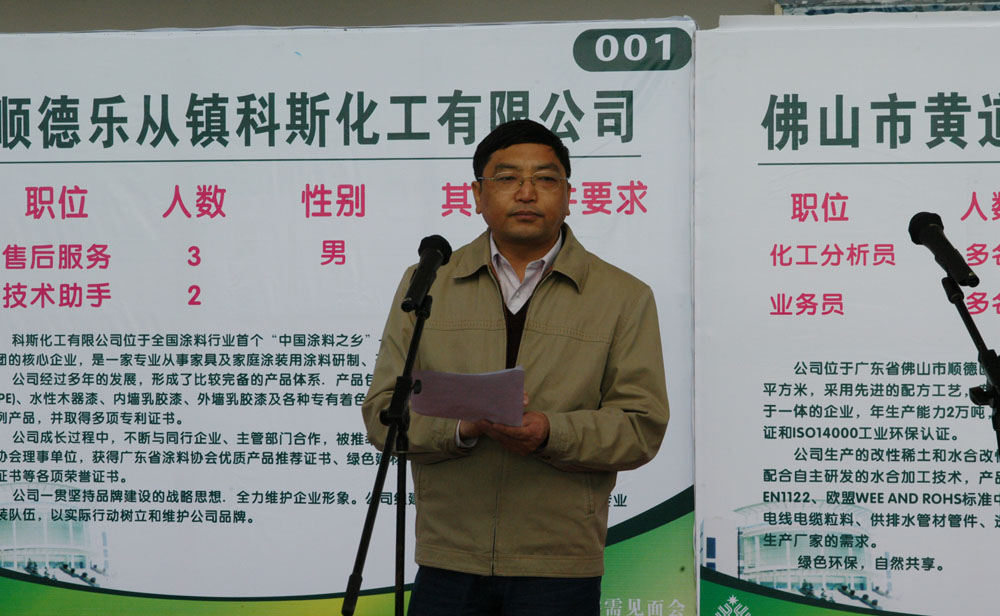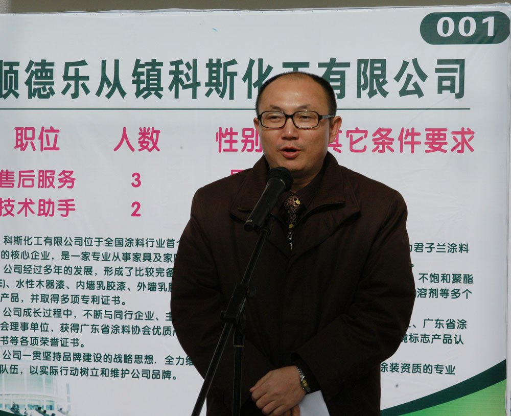 陈粟宋副院长为本次供需见面会致开幕词。他在讲话中回顾了我院应用化工技术专业开设的历史。他说,2004年2月,为适应地方经济发展的需要,经过广泛的调研,特别是在顺德及周边地区涂料商会、企业的大力支持下,我院开设了应用化工技术专业。陈副院长代表学院向企业表示了衷心的感谢。对毕业生们,陈副院长说,今天,我们培养的第一批毕业生即将走进企业,接受检验。祝愿广大毕业生能够走好进入社会的第一步,为实现自己的人生理想打下良好的开端。