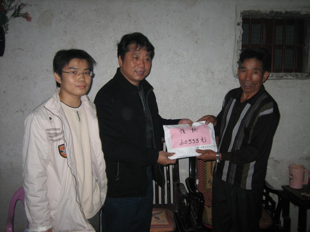 12月13日,由学生处周发新副处长、艺术设计系辅导员黄淼瀚以及学生代表卢春伟组成的慰问团一行三人,前往汕头市澄海区坝头镇,将广大师生捐献的60333元善款交到我院05园林班身患再生障碍性贫血的王俊标同学父亲手上。他的父亲握住老师的手不断地讲“学校太好了、领导太好了、学校想得太周到了”。