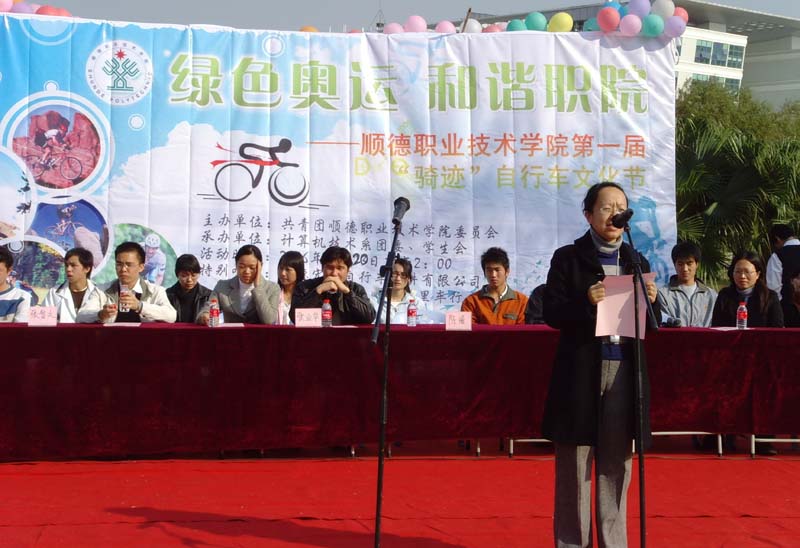 当日,学生处处长陈曦,院团委副书记张业华,顺德宏力公司赞助商代表,“万里车行”赞助商代表,计算机技术系书记、辅导员、老师以及来自各系的学生、老师参赛选手、观众等300多人参加了首届“骑迹”自行车文化节的开幕式。 陈曦处长为首届“骑迹”自行车文化节开幕式宣布开幕,礼花绽放。随后,院团委副书记张业华为首届自行车环湖大赛鸣第一枪,20名选手风驰电掣般冲出起点,驰骋环湖校道。