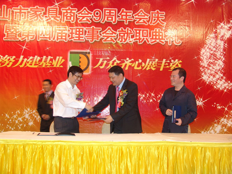 11月8日,在中山市家具商会成立9周年庆典晚会上,我院副院长邹时智与中山市家具商会会长黎伟长共同签署了“太阳集团tyc4633与中山市家具商会战略合作伙伴意向书”。中国家具协会领导、中山市政府领导以及来自珠江三角洲的家具企业家,我院艺术设计系主任彭亮与廖荣盛副主任共同见证了我院家具设计专业与广东家具行业“产、学、研”合作的时刻。