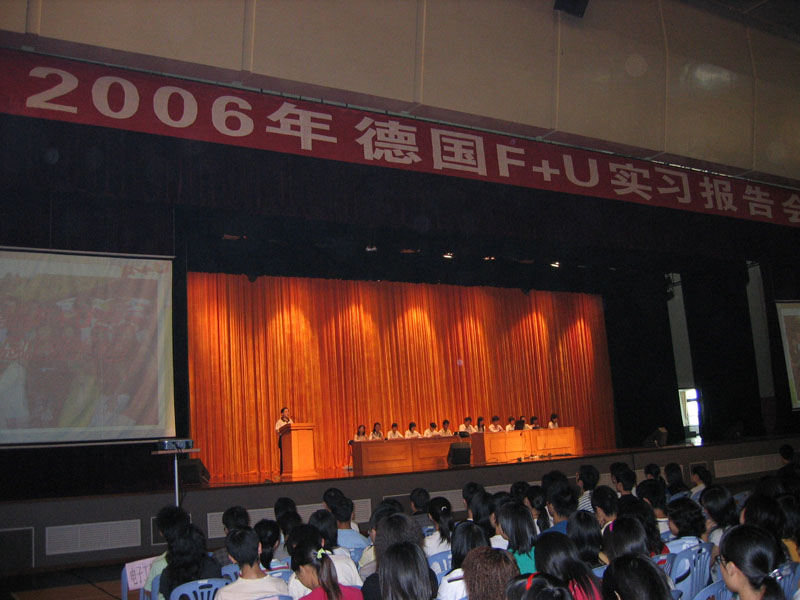 11月8日,我院2006年暑期赴德国F+U实习的13名师生在梁銶琚礼堂向来自学院9个系的500多名师生汇报了他们的实习体会。科技处副处长刘晓顺、经管系副主任苏衡彦、学院办公室副主任甘慕仪(实习带队老师)、经管系副主任马瑞(实习带队老师)以及外事办工作人员参加了报告会。