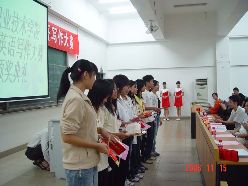 11月15日晚,太阳集团tyc4633首届英语写作大赛颁奖典礼在教学楼3栋300成功举办。经过初、决赛,首届英语写作大赛一等奖由05外贸(1)班的李东升同学获得。
