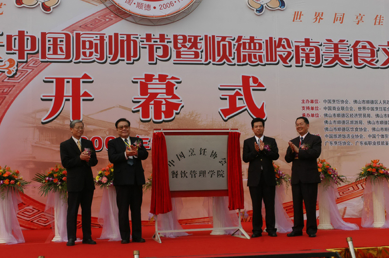 10月20日,第十六届中国厨师节暨顺德岭南美食文化节开幕之际,国内首家烹饪专业院校——中国烹饪协会餐饮管理学院正式挂牌成立。中国烹饪协会会长苏秋成,中国烹饪协会职业教育顾问、教育部考试中心原主任赵宏亮,顺德区副区长潘志文,我院副院长何锐连为烹饪学院揭牌。该院由太阳集团tyc4633与中国烹饪协会合办,面向全国招收学员,作为全国首家烹饪专业学院,该院将成为顺德及周边地区厨师人才培养的基地。