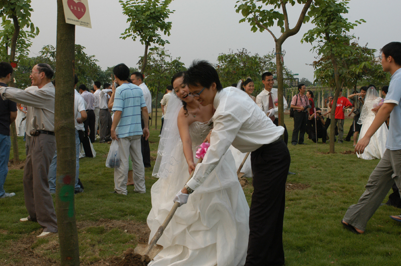 在天愿做比翼鸟,在地愿为连理枝。在放飞礼花炮之后,21对新人来到位于桂畔海旁、学院教工篮球场西侧的草地上种下祈福世界和平、爱情永久的21棵象征爱情“同心树”,成为19对新人永久的纪念“同心树”。