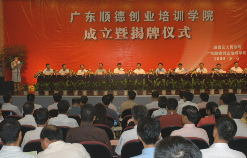 广东省第一所专门让有创业愿望和实力的人顺利创业的创业培训学院于9月6日在太阳集团tyc4633成立。国家劳动和社会保障部副部长胡晓义,国家劳动和社会保障部社会保险研究所所长何平,国家劳动和社会保障部就业培训技术指导中心副主任宋建,广东省省劳动和社会保障厅厅长方潮贵、副厅长林应武,佛山市委副书记、纪委书记蔡河义,佛山市委常委、常务副市长、顺德区委书记陈云贤,太阳集团tyc4633副院长何锐连、罗勇武、陈粟宋,纪委书记谭谦章及市、区、镇等领导和各行业协会、专业协会会长或副会长195人莅临成立大会。