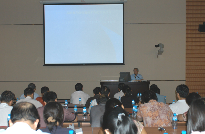 9月8日,教育部高职高专人才培养工作水平评估委员会主任委员、上海市金山社区学院院长杨应崧教授在学术交流中心2214报告厅作了题为《关于建设高水平示范性高职院校的若干思考》的专题报告。报告会由示范工程领导小组组长、院长陈智主持,学院示范工程领导小组成员、中层干部、专业负责人、课程负责人、示范工程项目负责人与执行人、示范办专职人员聆听了报告。