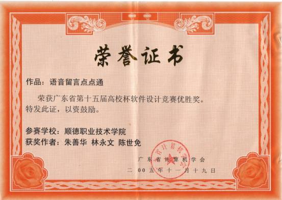 2004年11月19日,由广东省计算机协会主办,广东机电职业技术学院承办的第十五届的广东省“高校杯”软件设计大赛决赛在广东机电职业技术学院举行,计算机技术系作品《语音短信点点通》(03网络56班朱善华、陈世免、林永文)获得了优胜奖,《学生精灵助手》(04软件2班何培坚、吴灵敏、郭文宽)获得了最佳演示奖。