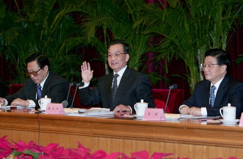 11月7日,全国职业教育工作会议在北京召开。中共中央政治局常委、国务院总理温家宝在会上发表重要讲话。中共中央政治局常委、国务院副总理黄菊主持会议。(新华社记者马占成摄)