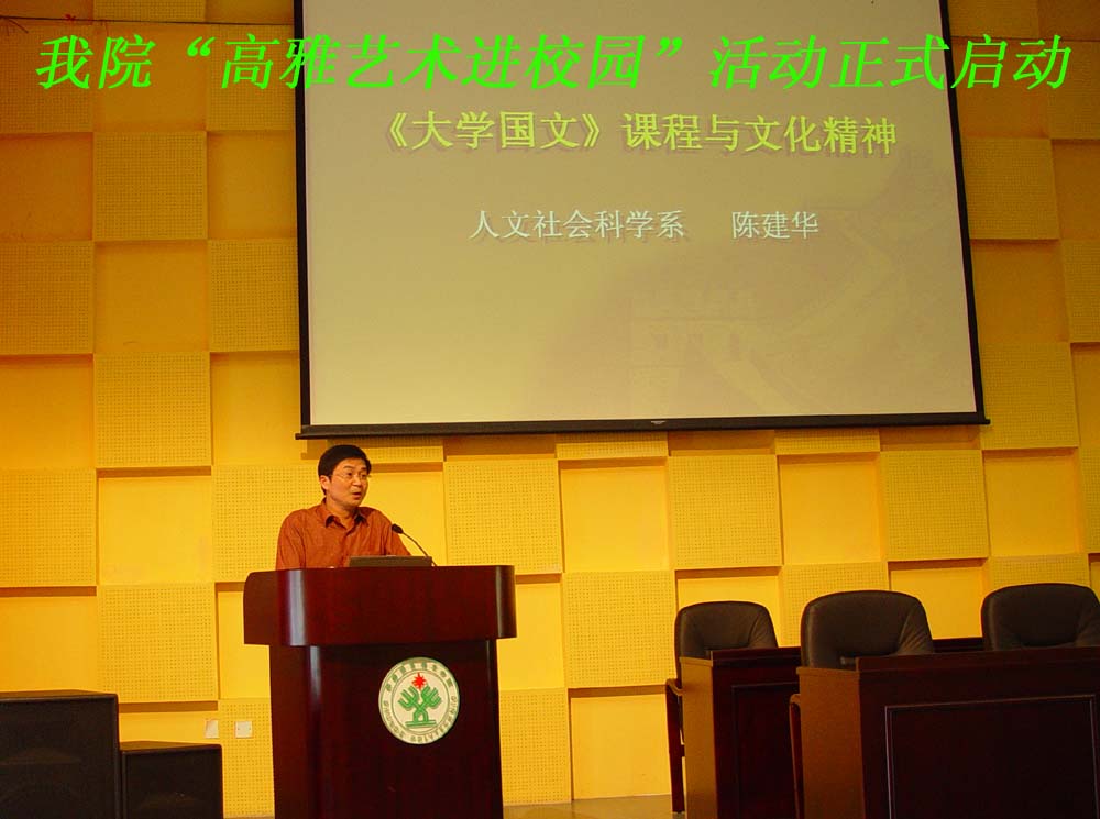 为提高广大师生的艺术人文修养,我院“高雅艺术进校园”活动11月16日正式启动,人文社会科学系主任陈建华 “《大学国文》课程与文化精神”首先开讲。我院院长陈智、纪委书记谭谦章、全院中层干部及全体教师前往报告厅参加了本次讲座。