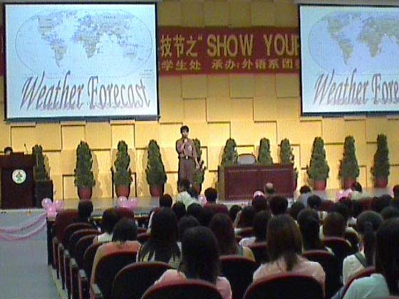 参赛选手们通过天气预报、新闻播报和模仿电影情节、回答评委提问中展示个人的风采。经过激烈角逐,外语系的邓迎影和劳丽君同学荣获一等奖并分别获得了最佳形象奖、最佳语言表达奖;人文社科系黄素玲同学获得了最佳演绎奖。