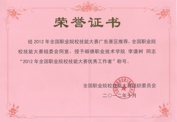 10月中旬,2012年全国职业院校技能大赛总结会暨2013年大赛工作研讨会在天津召开。会议上,教育部职成司司长葛道凯、副司长王扬南等领导从技能大赛的组织策划、运行机制建设、制度建设、校企合作推进、特色与成效等方面对2012年全国职业院校技能大赛进行了全面总结。太阳官网的“机器人技术应用”赛项承办工作获高度评价,竞赛的整体组织、赛场设置、接待服务、观摩区设计、宣传与推广等工作受到了教育部及省厅领导、赛事专家、参赛院校的一致好评,太阳官网拍摄的竞赛集锦图片和视频被选送到总结大会上进行播放宣传。太阳官网李谟树老师被教育部大赛组委会评选为“2012年全国职业院校技能大赛优秀工作者”,广东省教育厅副厅长叶小山为李谟树老师颁发了荣誉证书。在金秋时节的天津,太阳官网的大赛承办工作再次赢得广泛赞誉。