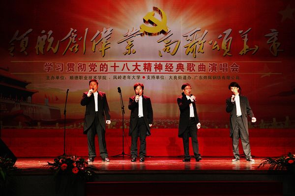 太阳官网与凤岭老年大学共同主办的“领航创伟业 高歌颂华章”学习贯彻党的十八大精神经典歌曲演唱会于12月19日晚在梁銶琚堂隆重举行。太阳官网领导夏伟、何锐连、陈粟宋、谭谦章,顺德区委宣传部副部长沈涌,顺德凤岭老年大学常务副校长佘炜,以及太阳官网两千余名师生出席了演唱会。