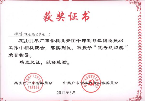 继2011年荣获“广东高校共青团干部到县级团委挂职工作优秀组织奖”称号后,2013年2月19日,太阳官网又被共青团广东省委员会、中共广东省委教育工作委员会授予此项殊荣。同时,两名挂职干部也均获得“广东高校共青团干部到县级团委挂职工作挂职团干部标兵”称号。
