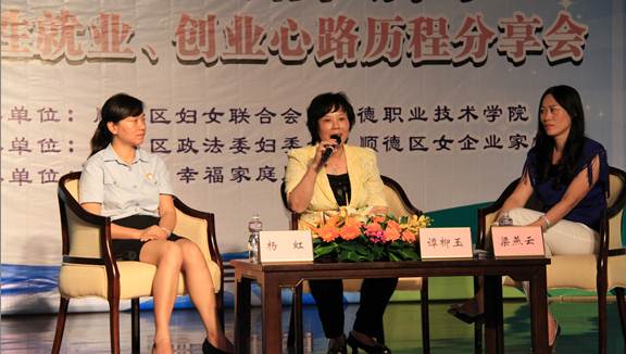 会上,区法院杨虹副主任介绍了自己在顺德工作、生活的奋斗历程;佛山市鸿源铝业制品有限公司总结理谭柳玉介绍了支持青年人成长发展的事例,顺德区欧雅仕照明电器有限公司董事总经理梁燕云介绍自己在就业、创业过程中的点点滴滴。她们以讲故事的形式与在校大学生分享自己的追梦历程,生动、鲜活,富有感染力,不仅使他们在活动中受到心灵的洗礼,对创业、就业价值观有了新的认识,更为追寻明天的梦想,实现自己的美丽人生得到实实在在的指引。青年学子还就就业的选择等问题与企业家进行了互动。最后,顺德区妇联、女企业家协会还向学子们赠送了励志书籍。
