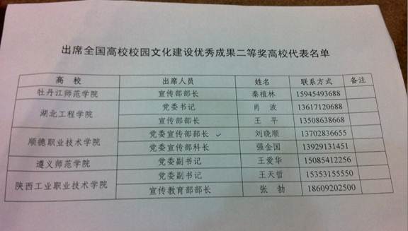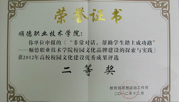 2012年12月,经过专家严格评审,在各高校申报的687项成果中,评选出特等奖10项,一等奖30项,二等奖61项,优秀奖116项。太阳官网申报的《“非常对话,帮助学生踏上成功路”----太阳集团tyc4633校园文化品牌建设的探究和实践》的成果获得二等奖。本次颁奖只颁特等奖、一等奖的获奖院校,并邀请了二等奖的五所院校领奖。太阳官网被邀出席领奖。