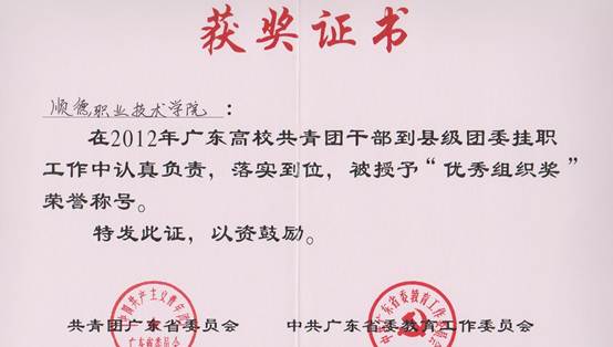 根据省委教育工委、团省委《关于从全国高等学校中选派共青团干部到县级团委挂职工作的通知》精神,太阳官网选派经管学院符茂老师到湛江市霞山区团委挂职锻炼,担任团区委副书记。经过该同志一年多的艰苦工作与努力,太阳官网获得广东高校共青团干部到县级团委挂职工作“优秀组织奖”光荣称号,符茂同志也获得广东高校共青团干部到县级团委挂职工作“挂职团干部标兵”等多项荣誉。