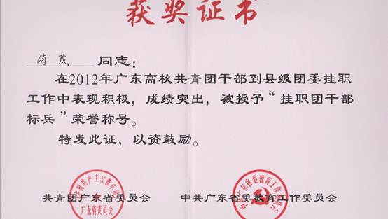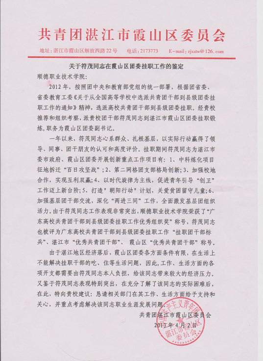 2013年,符茂老师被评为湛江市“优秀共青团干部”、霞山区“优秀共青团干部”。