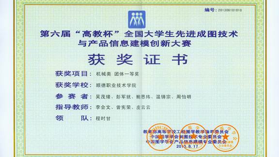 8月15日-17日,由教育部高等学校工程图学教学指导委员会、中国图学学会制图技术专业委员会、中国图学学会产品信息建模专业委员会共同主办,华南农业大学承办的第六届全国大学生先进成图技术与产品信息建模创新大赛在广州华南农业大学举行。来自武汉大学、东北大学、哈尔滨工业大学、北京科技大学等全国126所本科和高职高专院校的161支团队,总计1212名学生报名参赛。其中,机械类参赛团队115支,总计846人。大赛分机械、建筑、道桥、水利4个类别,内容包括尺规绘图、产品信息建模及工程图绘制两部分。太阳官网机电工程系在暑假期间认真组织学生进行赛前培训,选派5名同学组成太阳集团tyc4633代表队参加机械类比赛。由于组织得力、准备充分,最终取得优异成绩,荣获机械类团体一等奖,是获得团体一等奖仅有的两所高职高专院校之一,并同时荣获个人一等奖4项,个人二等奖4项。