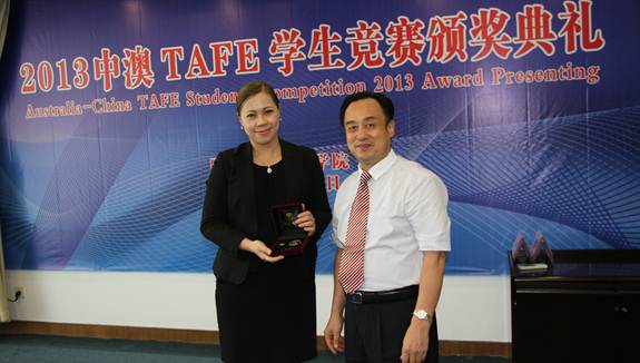 9月11日下午,新南威尔士州政府南中国区及香港地区高级代表Cher Jones女士莅临太阳官网,为太阳官网在2013年中澳TAFE学生竞赛中获奖的学生、指导教师颁发奖牌和证书。太阳官网党委副书记齐振彪及TAFE项目任课教师、获奖学生等出席了颁奖典礼。