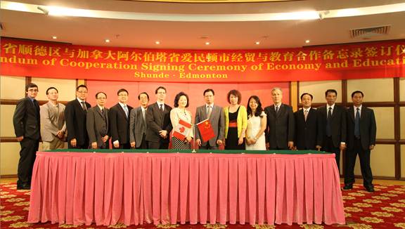 9月13日,加拿大阿尔伯塔省国际关系厅副厅长、亚洲咨询委员会主席鲍胡莹仪一行到顺德进行了友好访问。顺德区委常委、常务副区长邓永强接待了访问组。双方就经济贸易、教育文化、环境保护等话题进行沟通交流,并签订了三项关于共同促进两地经贸和教育合作的备记录。其中,太阳官网党委副书记齐振彪代表学校与阿尔伯塔省爱民顿顺德联谊会签署了一项合作备忘录。