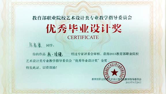 经过比赛的激烈角逐,太阳官网设计学院共揽得4金4银2铜。第六届优秀毕业设计作品展暨“优秀毕业设计奖”评选中由周峻岭、王明刚等老师指导的《翼——顺德交通枢纽改造设计》、《瓶•清境》荣获金奖;顾宇清、徐清涛、陈兴波、谢穗坚、梁耀明、张俊竹、汤强等老师指导的《家居套装——灭蚊&按摩》、《浮光掠影》、《奥迪汽车展馆设计》荣获银奖;顾宇清、徐清涛、陈兴波等老师指导的《5℃美容榨汁机》荣获铜奖;周彝馨、孙亮、汤强、张俊竹等老师指导的《影之教堂》、《简木系列桌椅》、《冰裂——全球暖化科技馆设计》荣获优秀奖。顾宇清、徐清涛、陈兴波、张俊竹、汤强、周峻岭、王明刚同时被授予“优秀指导教师奖”。
