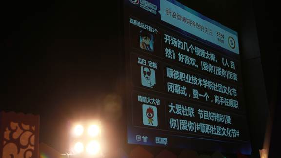 晚会在精心制作的开场视频和震撼的乐队表演中拉开了帷幕,随后通过短片回顾了第二届社团文化节的精彩画面和丰硕成果,并表彰获得第二届社团文化节“我最喜爱的社团文化节活动”和上一学年“五星社团”荣誉称号的学生社团,为全校学生社团树立了榜样和追逐的目标。紧接着,武术协会带来的剑舞、拳术、双截棍等武术串烧表演弘扬了优秀的中华武术文化,景观协会惟妙惟肖的手影舞表演展现了学生对生态环境环保的认识,传递了党“十八届三中全会”提出的“进一步转变经济发展模式”的精神,创翔DV社的经典歌曲舞蹈串烧、舞蹈协会青春奔放的舞曲、体育类协会的轮番展示、活力四射的模特走秀纷纷秀出顺职学子青春激昂的奋斗激情和健康向上的精神面貌,博得现场观众的阵阵欢呼,魔术协会令人叹为观止的魔术表演更是把现场气氛推向了高潮。最后,晚会在全场大合唱的歌曲《奔跑》中圆满落幕。在唯美的灯光和音响效果配合下,整台晚会的氛围非常激励人心,观众始终保持高涨的情绪。据悉,晚会还得到森海动感、青曼时尚写真馆等社会单位支持的微博墙和门票抽奖奖品,溜冰鞋、旅游大奖、摄影大奖等丰厚大奖让师生们尽享欢乐。本次晚会开启了以#顺职社团文化节#为话题的微博墙,当晚引来20000多人次的热议与关注,登上了新浪微博的热门话题榜。同学们在微博中写道“社团文化节很不错,争取下一年还要参加”,“社团文化节活动真丰富,水平很高,太给力了”,足见社团文化节深受同学们的喜爱。