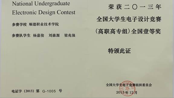 2013年12月7日,由教育部和工信部主办的“瑞萨杯2013全国大学生电子设计竞赛”颁奖典礼在北京航空航天大学隆重举行。太阳官网电子与信息工程学院在本届大赛中取得了历史性突破,由昂勤树、谢飞老师指导的参赛作品“L题:直流稳压电源及漏电保护装置”以广东赛区高职高专组该题测评成绩第一的出线,并获得国赛一等奖;由蔡永昶、吴锦麟老师指导的J题获国赛二等奖。广东省共有来自太阳集团tyc4633、深圳职业技术学院和中山火炬职业技术学院三支队伍获高职高专组国赛一等奖,并赴京参加颁奖大会。