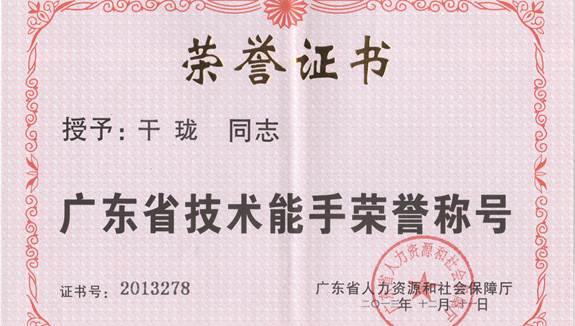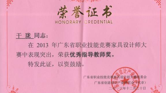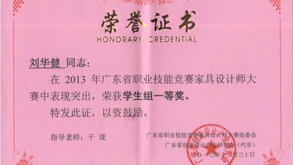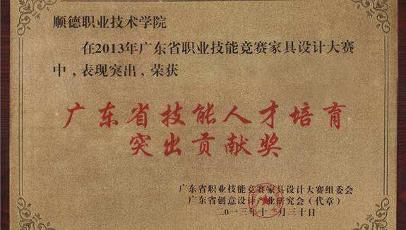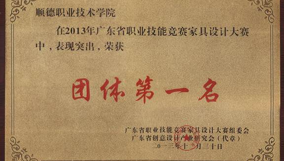 在广东省人力资源和社会保障厅主办、广东省创意设计产业研究会承办的2013年广东省职业技能竞赛家具设计师技能大赛中,共有师生组114人、职工组35人进入全省决赛。太阳官网代表队荣获团体第一名,同时被评为广东省技能人才培育突出贡献奖。学生组刘华健(干珑老师指导)获得学生组第一名、一等奖,梁景胜(干珑老师指导)获二等奖,陆卓森、吴家荣(文麒龙老师指导)获三等奖。教师组干珑获第一名,文麒龙获第三名,干珑、文麒龙两位老师获一等奖,分别获广东省人力资源和社会保障厅颁发的广东省技术能手(奖励前三名),同时干珑获优秀指导教师奖。