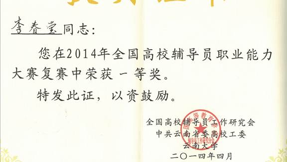 4月24至25日,由教育部思想政治工作司主办,全国高校辅导员工作研究会承办的 “全国第三届高校辅导员职业能力大赛复赛”在云南大学举行。太阳官网外语学院李春莹老师在六个省市的众多优秀选手中脱颖而出,继获得省赛一等奖后再次荣获华南赛区一等奖,将代表华南六省参加全国决赛。这是太阳官网参加该赛事以来所取得的最好成绩,同时太阳官网也是华南赛区晋级全国决赛高校中唯一的一所职业院校。