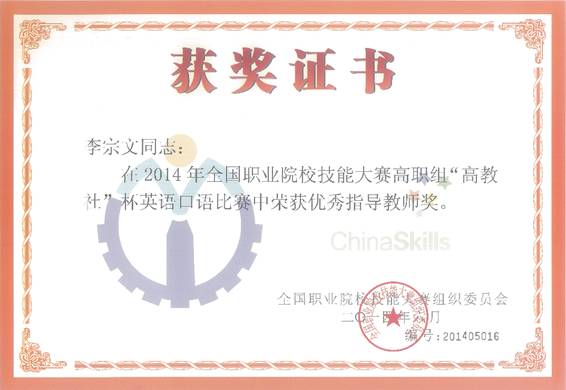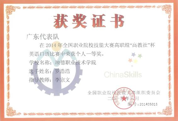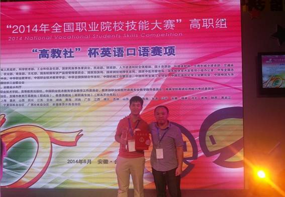 由教育部主办、安徽水利水电职业技术学院承办的“2014年全国职业院校技能大赛”高职组英语口语赛项总决赛于2014年6月18-20日在合肥大剧院举行。经过三天高强度的竞争,太阳官网2013级应用英语专业罗浩浩同学(广东省此项目的唯一参赛选手)荣获英语专业组一等奖,指导教师李宗文老师被授予优秀指导教师奖。