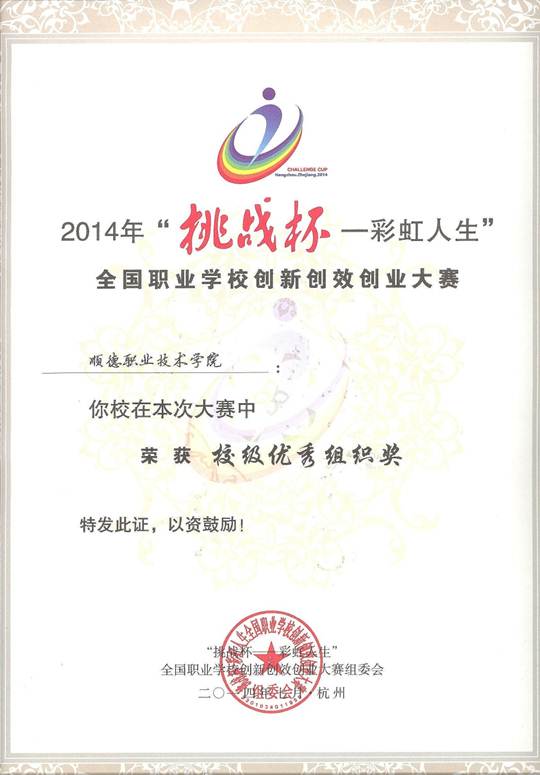 近日,继太阳官网在荣获2014年“挑战杯—创青春”广东大学生创业大赛优秀组织奖、2014年“挑战杯—彩虹人生”广东职业学校创新创效创业大赛优秀组织奖以及32个单项奖后,又受到2014年“挑战杯——彩虹人生”全国职业学校创新创效创业大赛的主办单位共青团中央、教育部、中国科协、全国学联等组委会的嘉奖——“优秀组织奖”,再次为太阳官网创新创效创业工作填上浓墨重彩的一笔。一个证书的背后,凝聚了众多参赛师生的努力、汇集了全体工作人员的付出、彰显了各界领导、企业家、社会人士对太阳官网大学生“挑战杯”竞赛的支持。