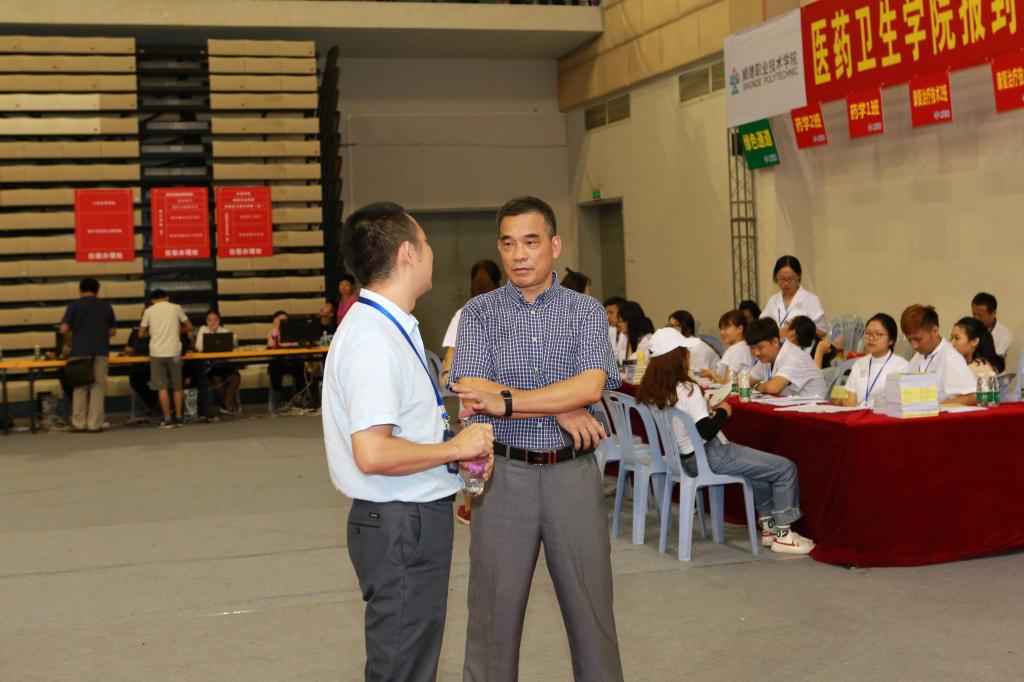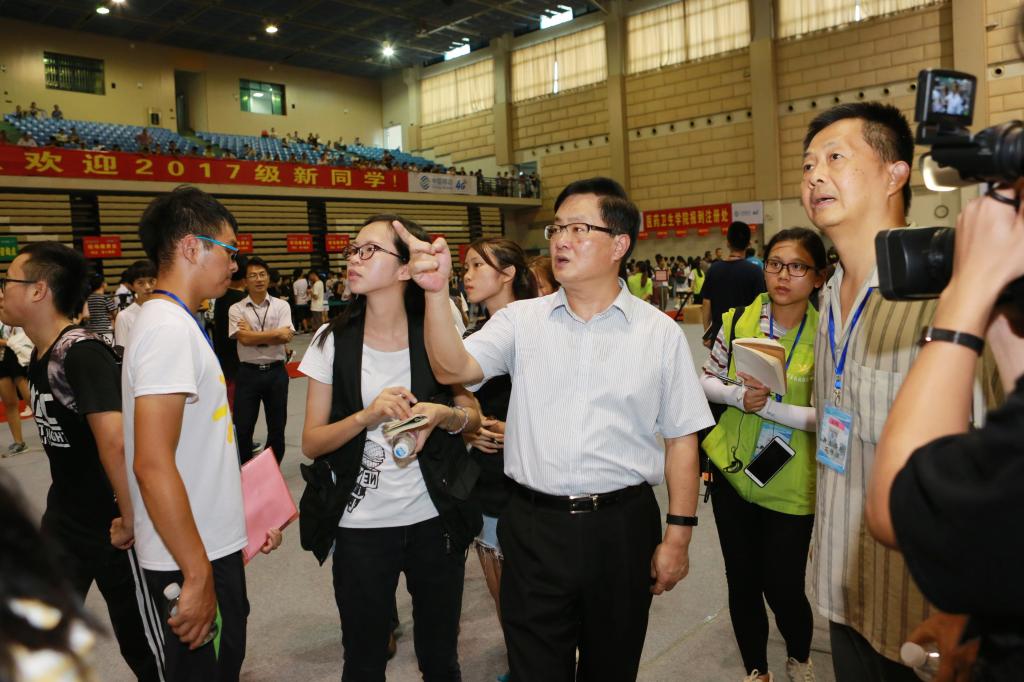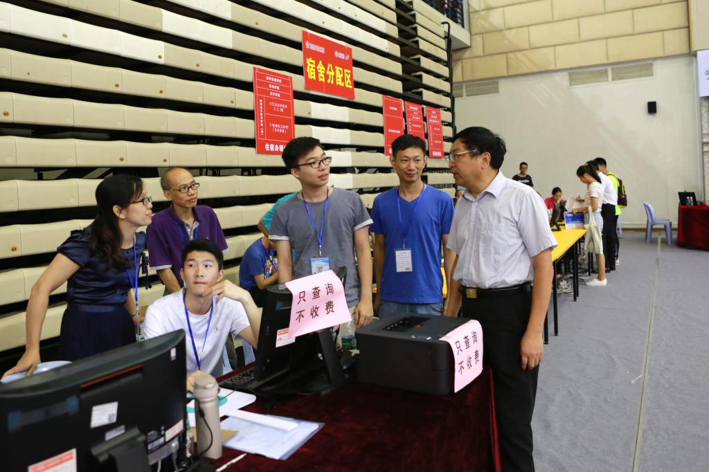 学校纪委书记谭谦章(右一)到迎新现场看望师生