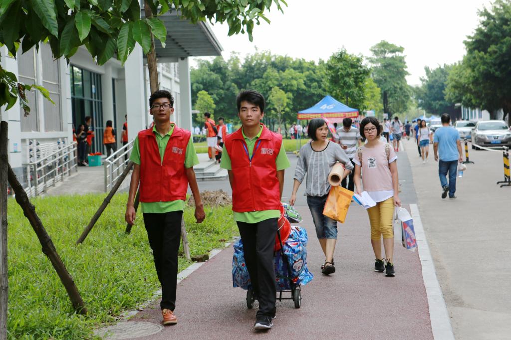 迎新志愿者帮助新生拉行李,引导前往宿舍区