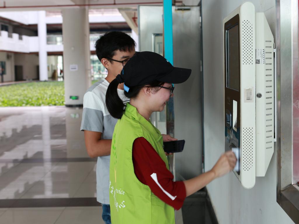 迎新志愿者指导新生使用校园卡终端机