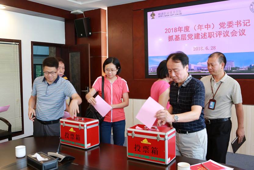 最后,与会人员对学校2018年度(年中)党委书记抓基层党建工作进行了评议和考核打分,评分表以匿名形式投入投票箱。
